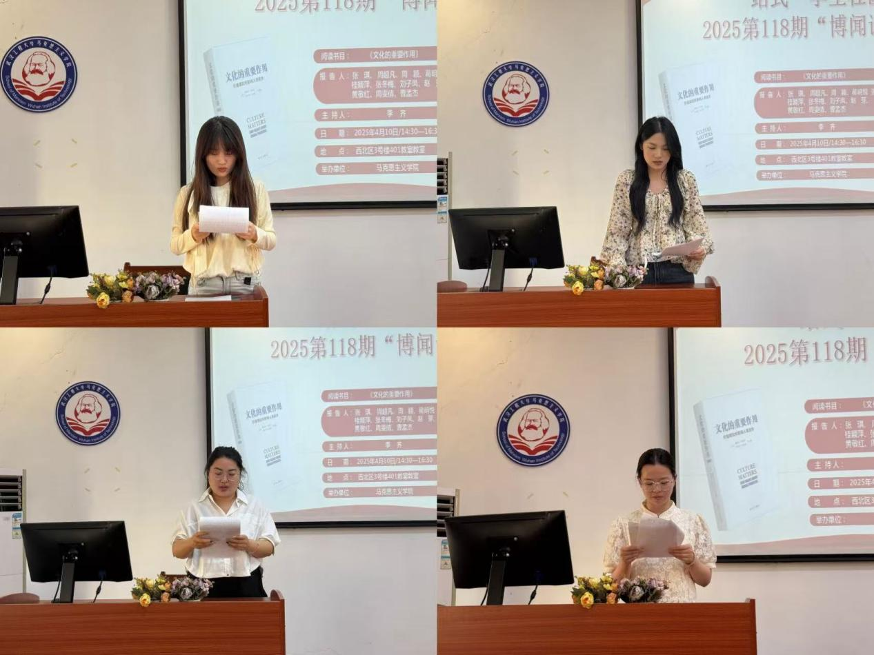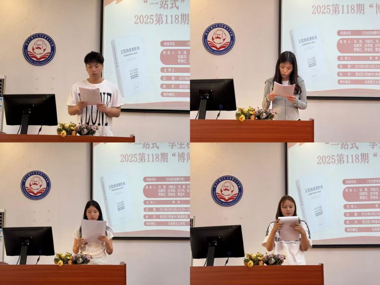 本网讯(通讯员 刘欣 张洋洋)4月10号下昼,我院第118期“博闻念书会”在腾博tengbo9885官网一站式学生社区中心(求是楼401课堂)顺遂召开。本次念书会围绕着亨廷顿、哈里森的著作《文化的主要作用》睁开讨论。本次念书会由李齐先生主持。加入此次念书会的11位研究生主讲人为24级周雯情、张琪、周颖、周超凡、黄敬红、曹孟杰、刘子凤、张冬梅、葛明悦 、桂颖萍、赵芽。院学术部“博闻念书会”运动小组组织了此次念书会。